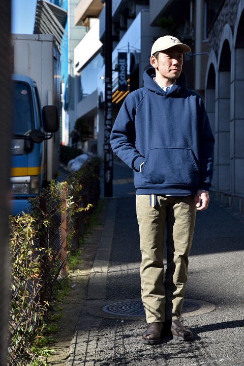 『パーカースタイルもボタンダウンシャツとパンツのシルエットで大人顔。』