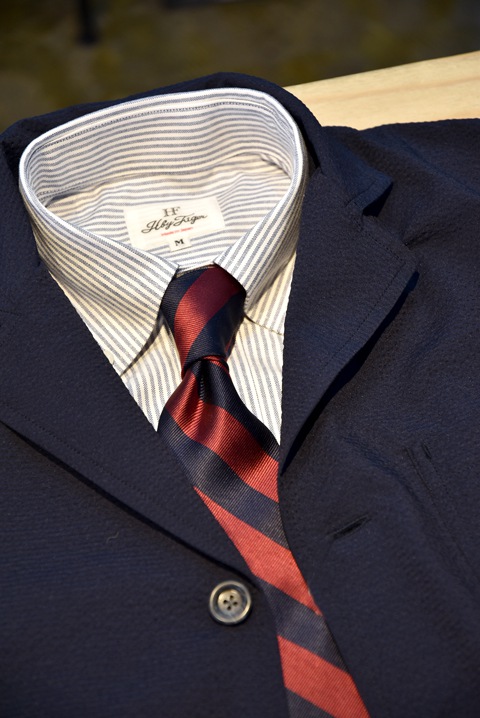 ん?と思われた方はかなり通ですね、ベントレークラヴァッツのネクタイでは左上がり、右下がりのレジメンタルを採用しています。一般的に目にするレジメンタルストライプは柄の方向が右上り、左下がりが多いですが、往年のアメリカのトラディッショナルタイの特徴として、左上がり、右下がりが用いられていることが多い。