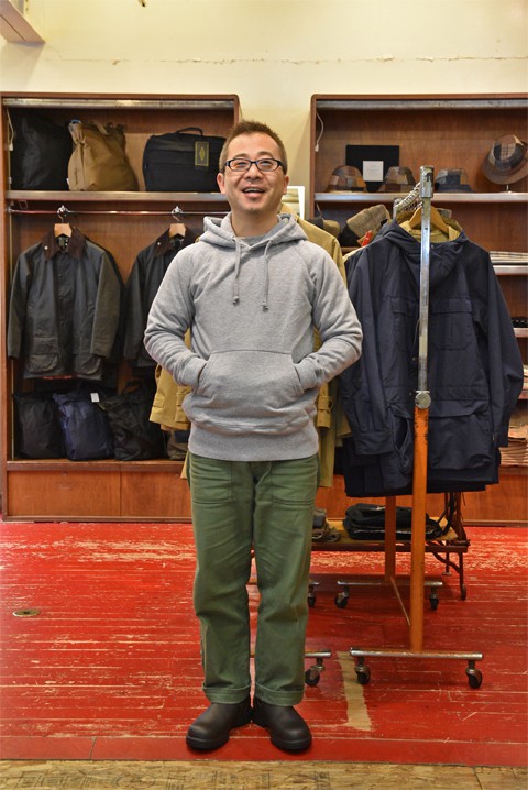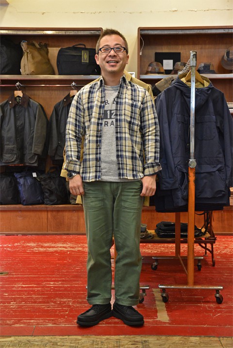 こちらは、太めのワーク系シルエットを活かした直球のアメカジスタイルで。