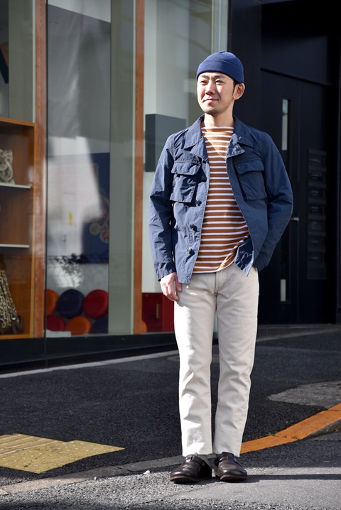 デザインの効いたアウターの場合は他のアイテムを極力シンプルに合わせるのが鉄則。