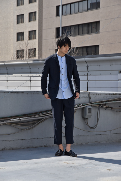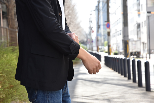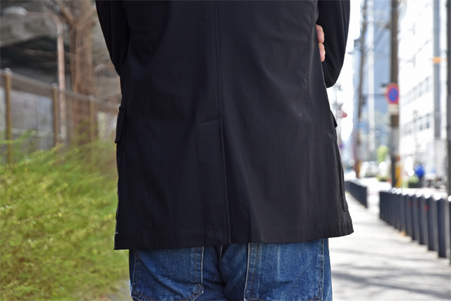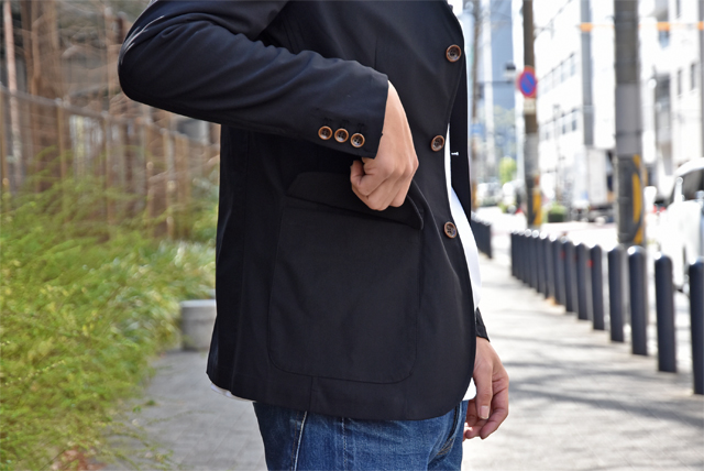 カジュアルな素材ですが、スリーパッチポケットにセンターベントとトラディショナルなディティールを備えております。