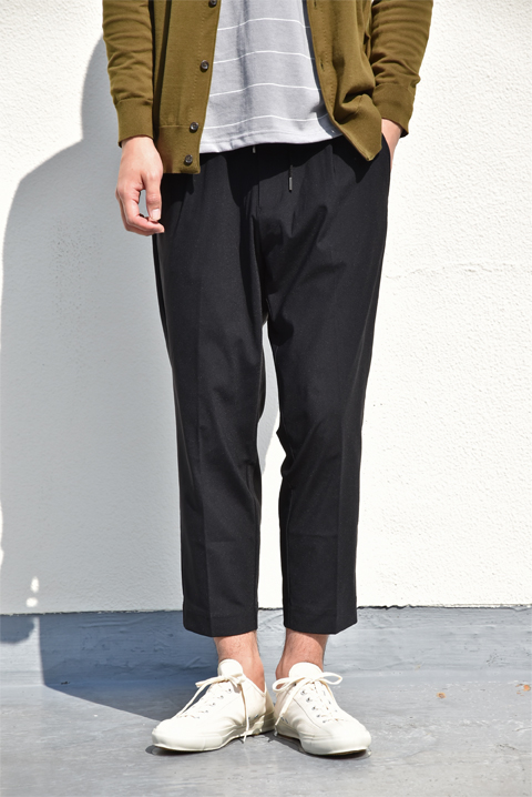 タックが入ったスラックスタイプのクロップド丈パンツ。 綺麗なテーパードシルエットにウエストは紐で絞るスピンドル仕様。ジャケットと同素材でストレッチが効いた快適な履き心地です。