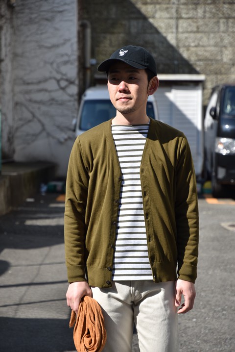 前からね、久々にカーディガンが欲しいと思ってたんですよ。メリノウールのたっかいのんぢゃなくって、シルエットが細すぎないの。理想は気軽に着れるコットン素材のポケットなしデザイン。そしたら良いタイミングで、大好きなブランドから出たんですよ! 展示会で見つけたときに、もうこれは個人買いだ! と即決でしたね。