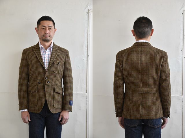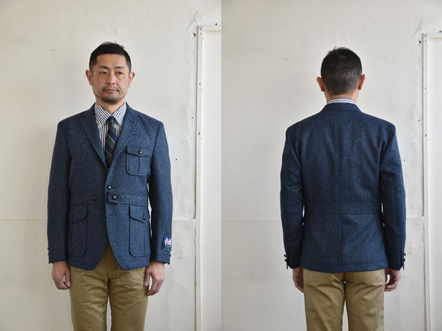 まずは新作のツイードジャケットをご紹介させてください。このジャケットは所謂ノーフォークジャケットと呼ばれているもので、本場英国の狩猟の際に貴族が着用したのが始まりだったそうでございます。現在は警察や軍用などにも幅広く応用されています。シューティングの際にジャケットを着た状態では動きに制限が掛かるため、ジャケットのサイズを大きくし、ボックスプリーツを取ることでシルエットを調整しているのでございます。それがあることでジャケットの形も崩れることなく美しい状態を保つことが出来ます。ボックスプリーツ以外にもベルトを付けることで型崩れを防いだり、エルボーパッチやガンパッチなど後日派生していった形も多数存在します。今回のH by Figerのノーフォークジャケットはシンプルなデザインなのでとても着やすいと思います。シングル3つボタン段返り、ノッチドラペル、チンストラップ、エルボーパッチ、ポケットは3パッチポケットで、しかも嬉しいプリ―テッドポケット。ボタンはクルミボタン。素材は英国のMOON社製でございます。ブルーとネイビーのヘリンボーンと、ブラウン系をベースとしたガンクラブチェックの2柄をご用意いたしました。サイズはS,M,L,XLの4サイズでございます。秋冬には紡毛のジャケットが温かく、しかも雰囲気も良くなるため大人の休日の1着として重宝されること間違いなしでございます。
