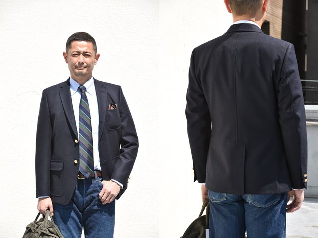 他方、昨年から定番でやらせていただきましたネイビーブレザー、通称「紺ブレ」でございます。これはシンプルかつ上品な仕上がりですから、結婚式の2次会やお祝い事の席にはとても感じの良いジャケットかと思います。なんだか「紺ブレ」を着てるだけでとても誠実そうに見えるのはワタクシだけではございますまい。そんな「紺ブレ」が今回もラインナップとして加わりました。小さなメーカーさんですから、製造がたくさん出来ずで申し訳ございません。しかしながら前もってご注文をいただくことで、寒くなる前にお届けすることが出来ます。昨年は在庫が無くて今年の秋冬をお待ちいただくという方までいらしてくださいました。今期も完売必至の可能性が高い為、前もってのご注文が非常にありがたいです。