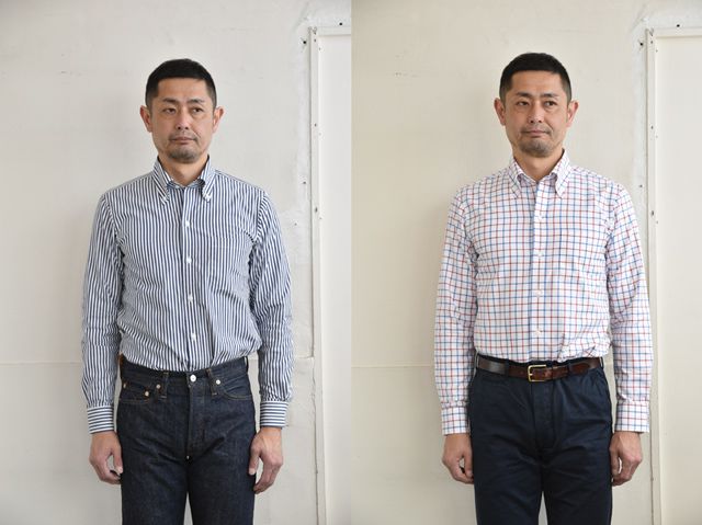 それから新作のシャツもご紹介して参りましょう!シャツの形は定番です。ボタンダウンの襟型で、襟の反り返りが美しくなるようにボタン位置を少し上げたところで留めております。しかも台襟が高めで、襟の長さも少し長めにしていますので、くるっとロールする様がなんとも美しいのでございます。フロントのボタンも最近は7つボタンが多いところ、敢えての6つボタンでございます。第一ボタンから第2ボタンまでの間隔が10cmと広めですので、襟のロールには欠かす事の出来ないゆったりとしたカーブを描くことが出来るのでございます。襟の話で引っ張り過ぎましたが柄はロンドンストライプが2色(ネイビーとサックス)これはありそうでない微妙な太さのストライプ柄でございます。太すぎるとファッション寄りになりすぎて、それにウィンドウペンが1色(白地に赤と青の格子柄)でございます。少し大きめのタッタソールチェックと申し上げても差し支えございません。白赤青3色のトリコロールカラーが作り手の気分を彷彿させているのが見て取れます。いかにも清潔感が漂い、デニムやジャケットにも程よく馴染んでくれること請け合いでございます。