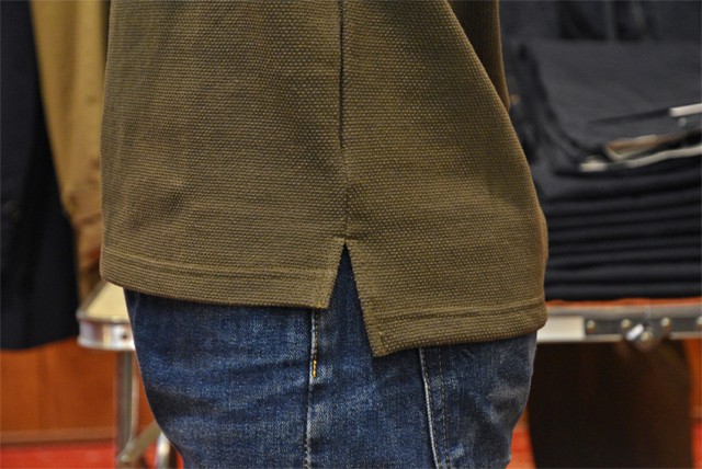 ラコステなどのポロシャツによく用いられる編み方の生地で、裾にはスリット入りです。