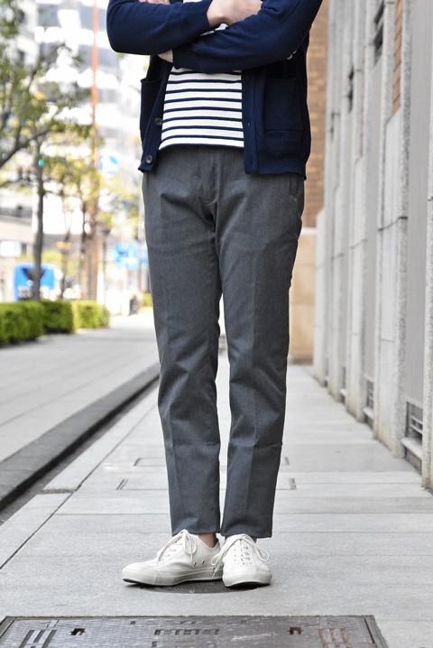 まずはグレーのM3トラウザーズでございます。何度も生地をアップデートして参りましたが、今回の生地で第3弾でしょうか。大変長らくオマンたせ致しました。やや肉のある生地感でストレッチ混でございます。膝の曲げ伸ばしは自由自在!これほどまでに楽ちんで良いのか!?というくらいの楽さ加減でございます。ビジネスでもカジュアルでも併用出来て便利、コットン素材なのでお洗濯もOKいつでも清潔にお召いただけます。センタープレスだけお手間ですがしっかりアイロンを掛けてあげてください。いつも良い雰囲気でお召いただけます!