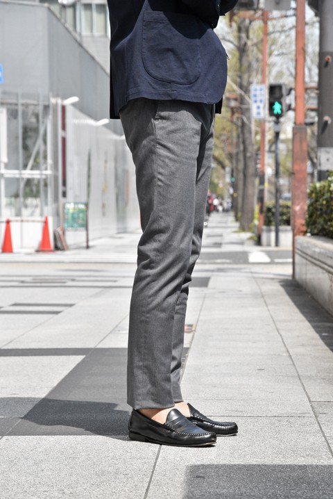 股上も浅くも深くもない丁度良い深さで、シャツなどタックインした時にもバランスの良い仕上がりでございます。裾丈は思い切ってすっきり短くお召しになられることをオススメいたします。たまにはダブル仕上げも素敵なんじゃないでしょうか!シルエットの美しさをぜひとも味わっていただきたい、そんなトラウザーズでございます。