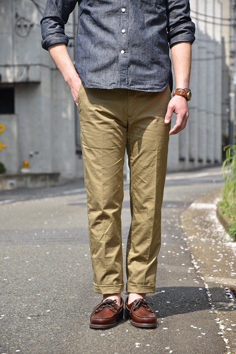 今回新色としてコットン平織り(→ほどよい光沢感のある上質な素材)素材のライトブラウンをご用意させて頂きました。こちらグレーに比べて薄手なので、肌触りの良さプラス清涼感漂う生地でお召いただけます。また色が素敵なんです!こちらはポリウレタンが入っていないためストレッチは効いておりませんが、その分生地の雰囲気を味わっていただける素材でございます。夏場は薄手のコットンパンツが大人のカジュアルを盛り上げてくれます。ポロシャツやリネンのシャツなどとコーディネイトしていただくだけで様になりますので、サラリと着こなしてくださいませ~!