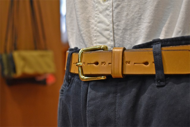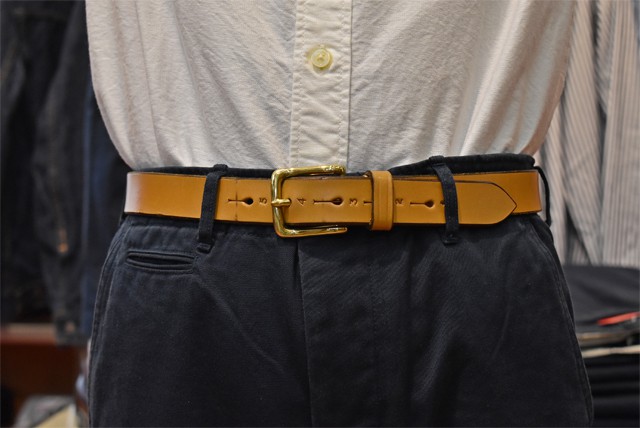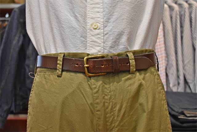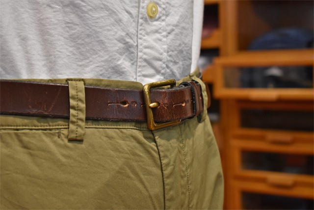 デニムやミリタリーパンツなどには幅広のややバックル大きめのギャリソンベルトなんかも良いですが、細身のチノやトラウザーズにはベルト幅約2,8cmのこちらの方がしっくりきますよ。