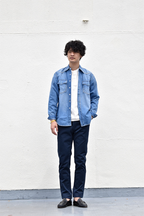 インナーにヘンリーネックのTシャツ、ネイビーのチノパンにローファーのコーディネート。