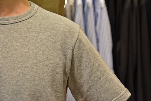 とてもシンプルなクルーネックの半袖Tシャツです。裏地部分がミニ裏毛という肌触りの良い生地を使用し、生地厚も薄すぎず厚過ぎずでとても着心地の良いTシャツです。