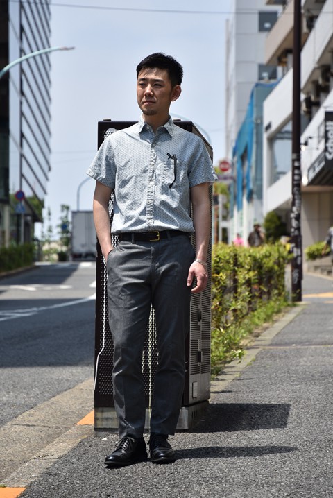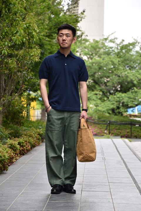 トラウザー以外にもワークパンツやミリタリーパンツとも好相性◎ パンツのシルエットに合わせてポロシャツもサイズアップで着用。夏のレザーシューズを使ったスタイルは襟付きのシャツが良いですね。