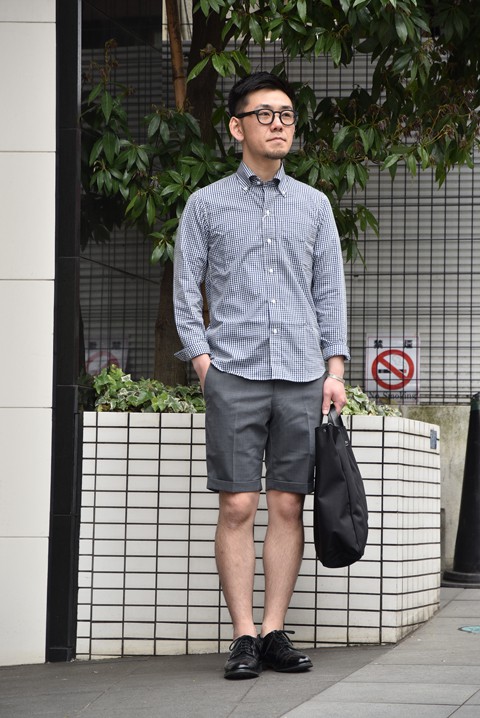 初夏に楽しみたい長袖+ショートパンツのコーディネイト。夏に黒の革靴は少し重たくなってしまうので、色味を抑えてあげることでバランス良くまとまります。ショーツを穿く際はカバーソックス(素足風)がおすすめです。