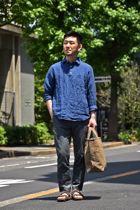 「SPINNER BAIT(スピナーベイト)のリネンシャツ+グレーのストレッチパンツで爽やかな初夏スタイル。バーンストーマーのTCストレッチチノはオンオフ問わず使え、さらにストレッチが効いているので穿き心地抜群ですね。」