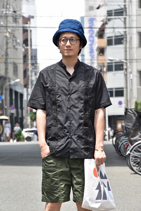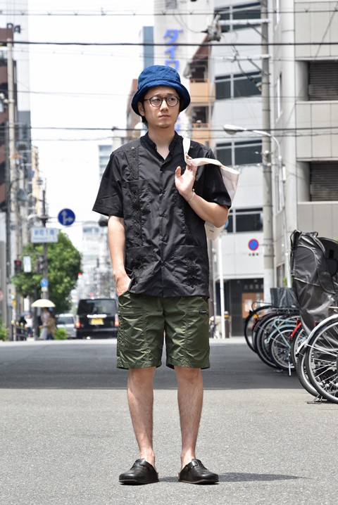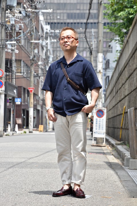 「夏場はゆったりしたスタイルが好きなので、全体的にワイドシルエットなスタイル。ラフになり過ぎないように足元は、レザーサンダルをチェイス。ナウンのシャツは野暮ったくなく、タイト過ぎない絶妙なゆったりしたシルエットなのでこれからの時期におすすめの1枚ですね。」