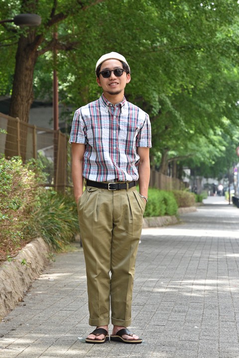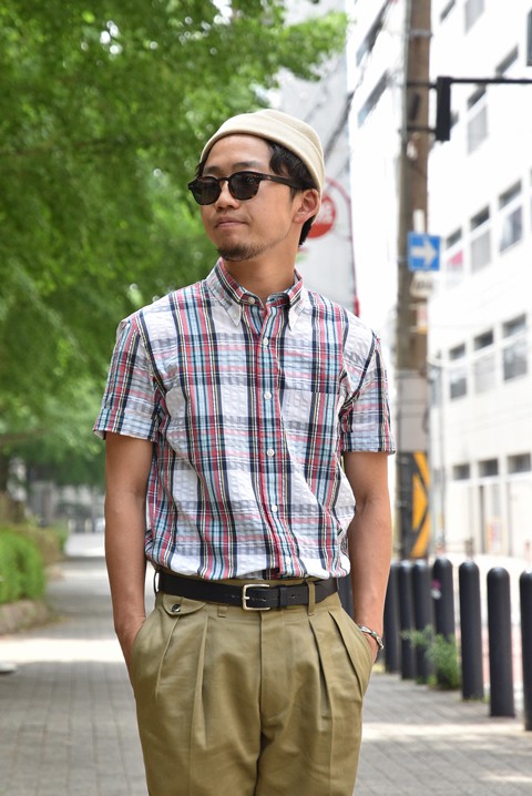 「夏に着る半袖シャツ。それもシアサッカーとなると季節感がより一層出て良いですね。太めのパンツにタックインして、革靴ではなくサンダルで。暑い夏でも快適に過ごせて、少しキレイ目に見えるシャツスタイルです。」