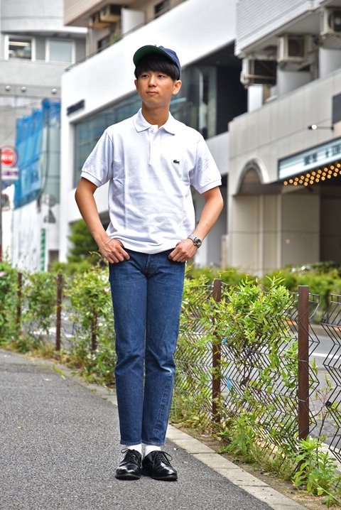 トップスはZABOU夏の定番、ラコステと合わせるのがシンプルで一番オススメの夏スタイルだと思います。足元はレザーシューズと合わせてデニムと一緒にエイジングを楽しむのも良いですね。