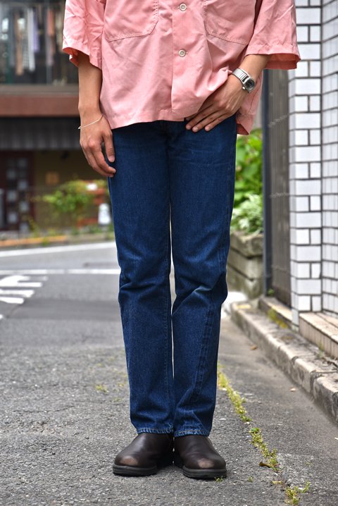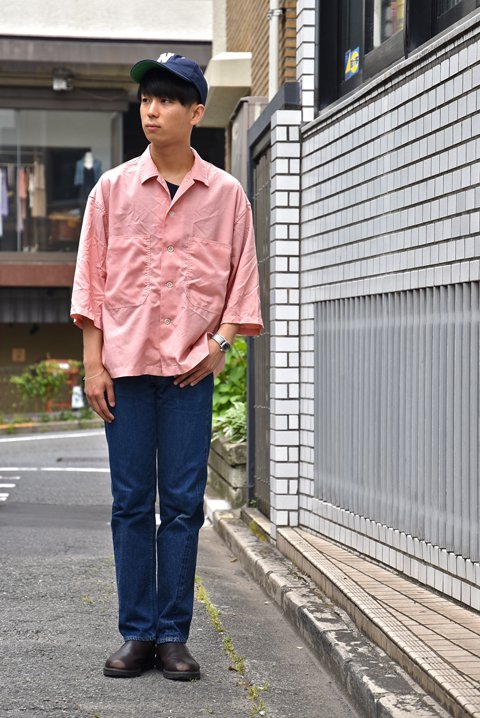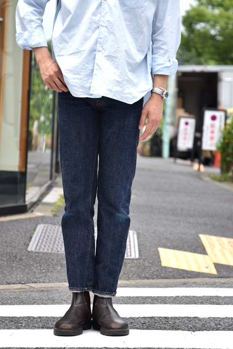 新調してまだ3週間ですが、お店で穿くことが多いため、膝の色落ちが早速出ています。ジャストサイズのシャツ以外にも写真のようなボックスシルエットのシャツと合わせてもまとまりのあるスタイルになるので、ゆったりしたトップスとも相性が良いです。