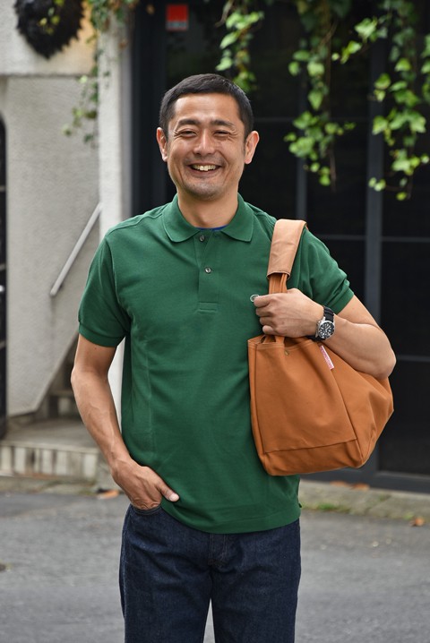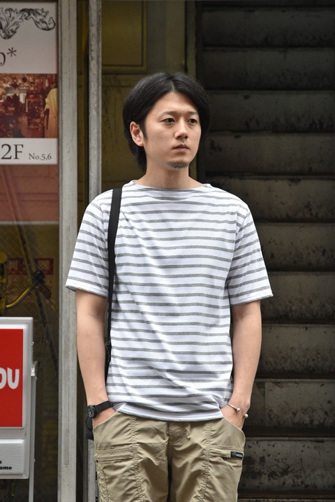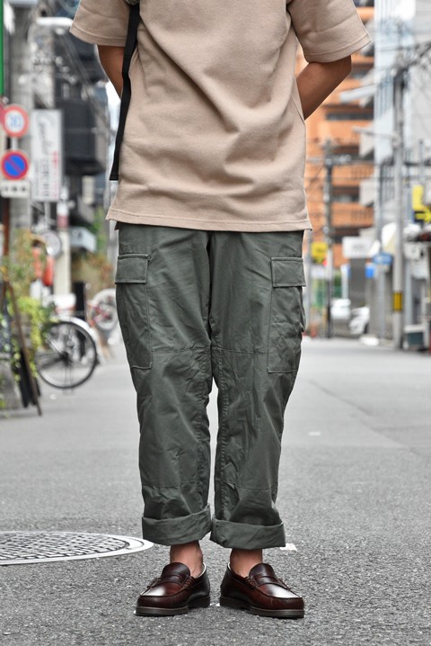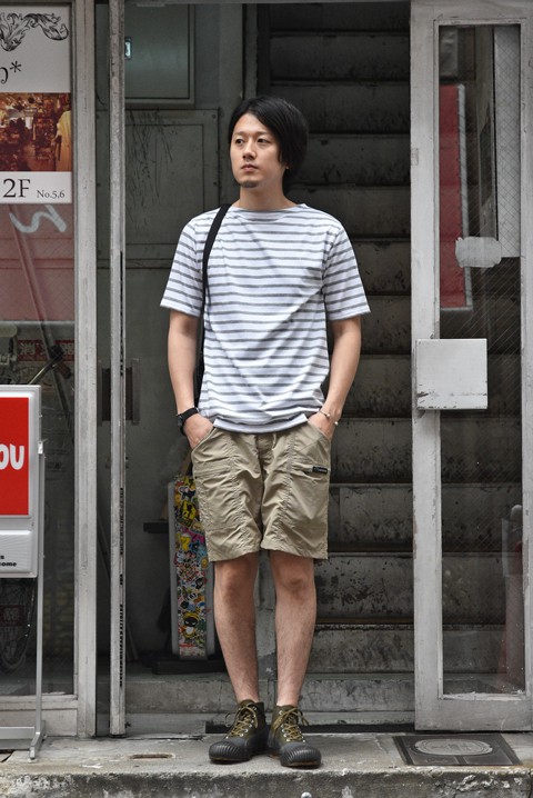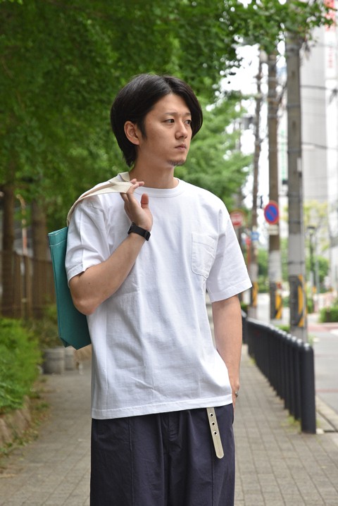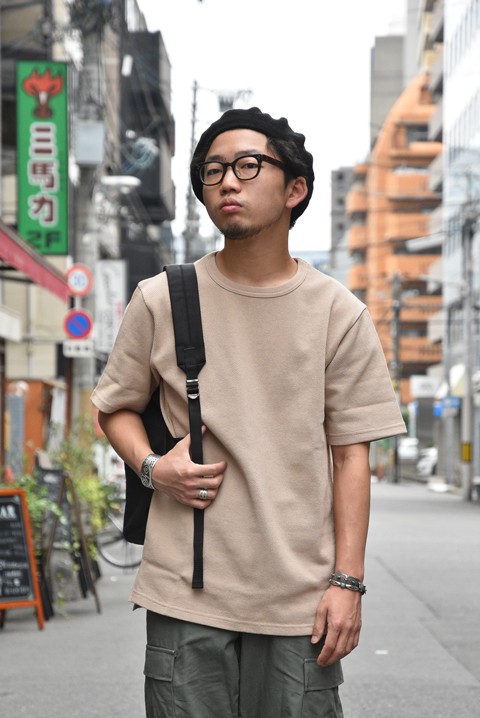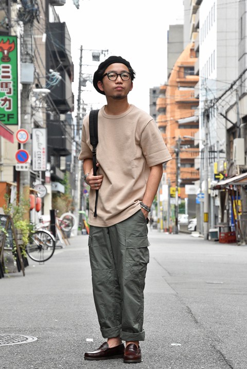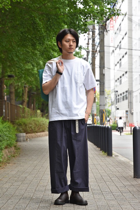 梅雨時期は雨もですが湿気のジメジメも気になります。鹿の子地のTシャツにリップストップの軍パン。共にさらりとした着心地の上下ラフなスタイルにコローちゃんで程よい締りを。