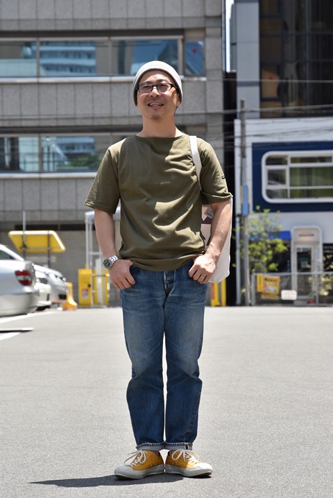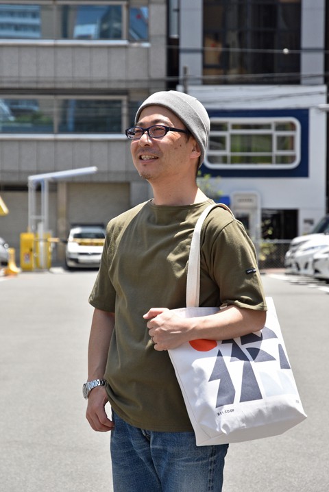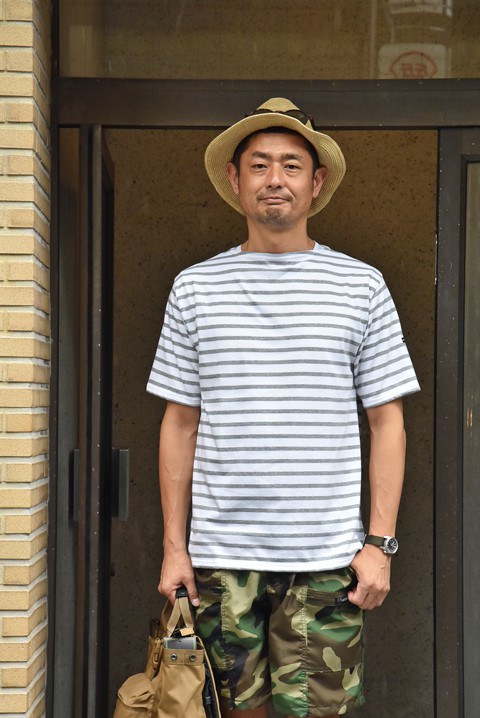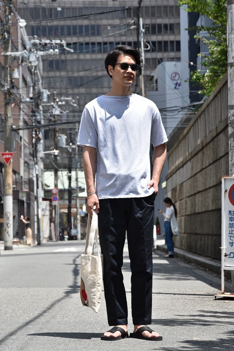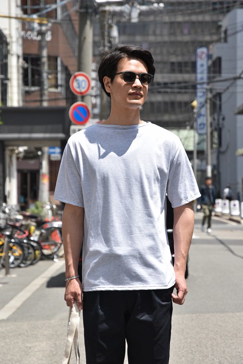 「杢のライトグレーは柔らかい雰囲気が特徴でネイビーのパンツに良く合いますね。セントジェームスらしい特徴的なボートネックは普通のTシャツとはまた違った雰囲気で着れますよ。」