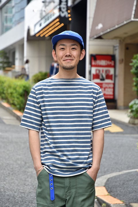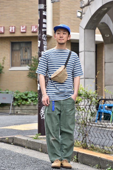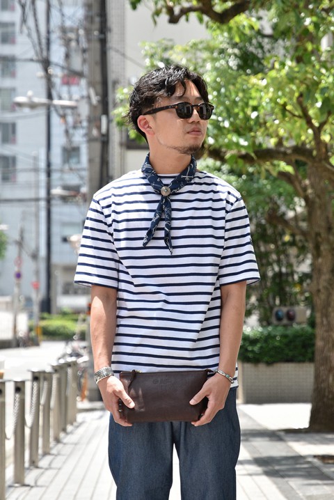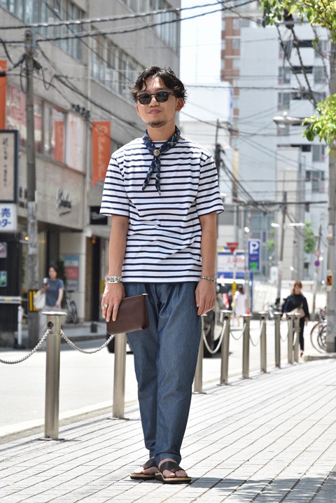 「ホワイトとブルーを基調とした、大人の夏休みスタイル。サンダルと小物はブラウン系でまとめました。リラックスした雰囲気のパンツと、ピリアックの肌触りの良さ。素材の良さで夏を乗り切りましょう!薄手のバスクシャツは今から真夏にかけて、秋はインナーに差し込んでも良さそうです。」