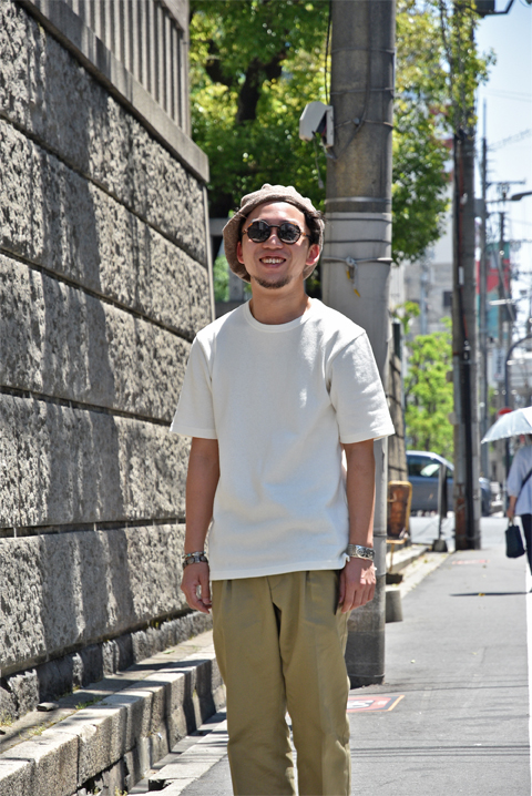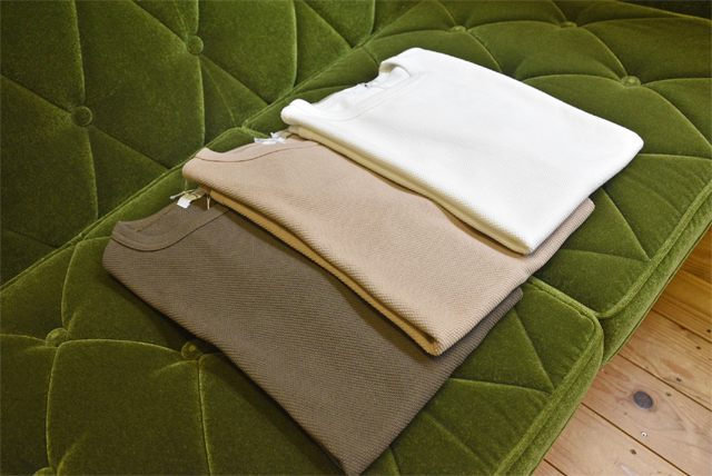ザラッとドライな米綿を、鹿の子編みというポロシャツなどに使われる編み方で仕立てているので、汗をかいてもTシャツが肌にへばりつかない、そして乾きやすい。