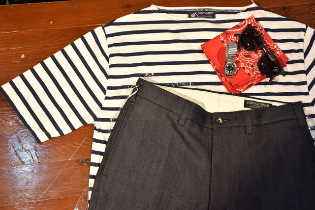 さらに着崩し、柔らかい印象なら、セントジェームスのカットソーで合わせたカジュアルコーディネート。マンネリなコーディネートにバンダナを首元に付けてアクセントを加えても良いですね。