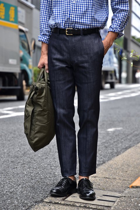 上品な光沢感のあるT/Cツイルをインディゴで先染めした生地は、 ハリ・コシ感があり、摩擦・シワに強く、窮屈感の無い快適な穿き心地が特徴です。