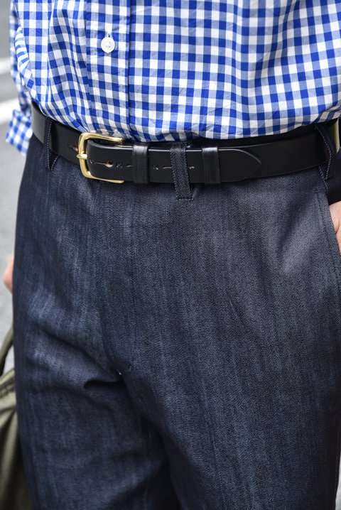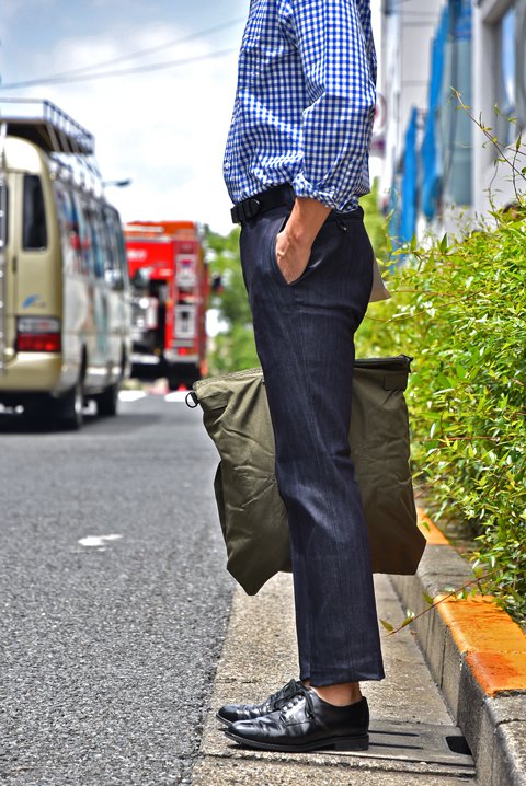 ギンガムチェックのボタンダウンシャツとレザーシューズを合わせた大人のドレスカジュアルコーディネート。小物はヘルメットバックを持ってあえて着崩し、少しラフな印象を与えてもいいですね。