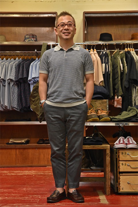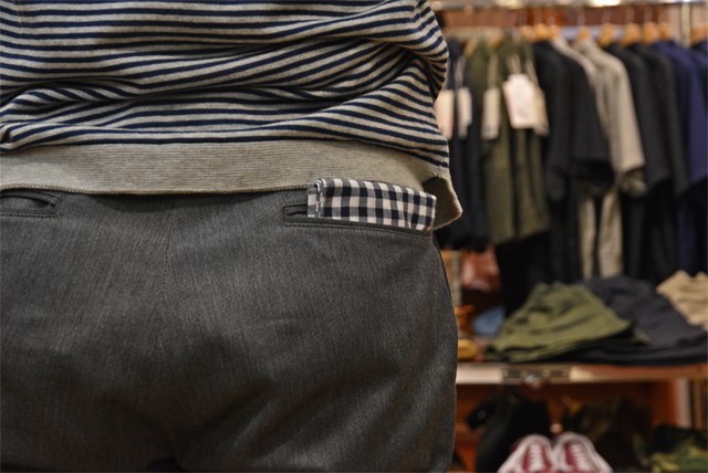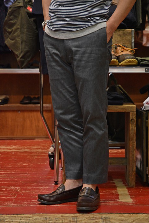 一方、TC ストレッチチノはお客様やスタッフ坂口の穿いている“サマ”を見て、エエなぁ~と刺激され・・・持っていないカラーのパンツという理由でこちらもお買い上げ。共にシルエットに穿きやすさは秀逸です。