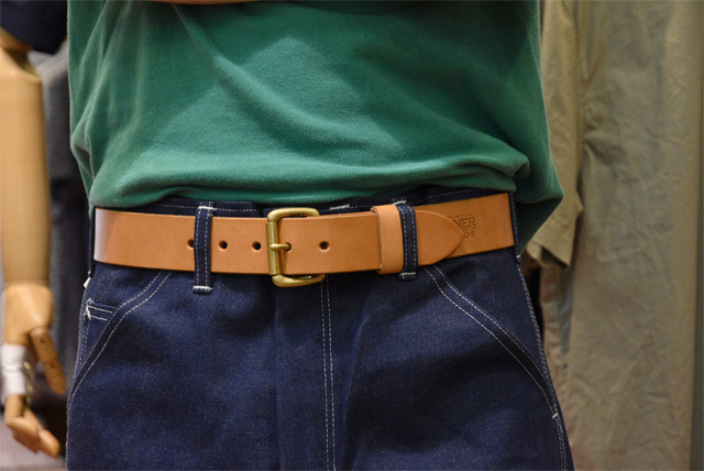 幅が、3.8cmの少し太めのタイプ。 主に、ジーンズやワークパンツに相性の良い太さです。 ZABOU定番のワークパンツStan Ray(スタンレイ) ペインターパンツ ネイビーデニムに合わせてみました。 パンツのボリュームに見合ったベルトの太さでバランスが良いです。 ちなみに、スラックス等、ベルトループが細いパンツには通らない事があるので注意が必要です。