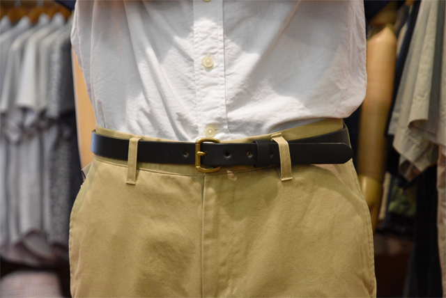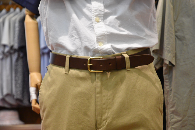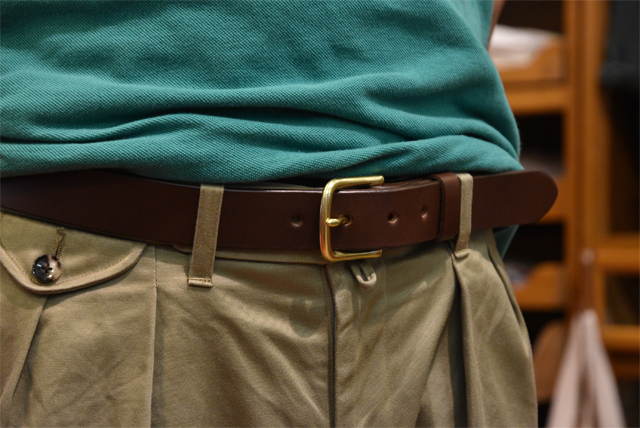一番使い勝手の良いモデルで、ベルト幅3㎝ですので太すぎず細すぎずでバランスの取れた一本です。 普段、ベルト一本を使いまわしているという方にはこちらのモデルがおすすめです。 幅広いパンツと相性が良いですよ。バーンストーマーのチノパンと合わせてみました。 TANNER GOODS(タナーグッズ)CLASSIC COGNAC(GOLD)  ¥16,200- 見慣れた太さでバランスも良いですね。