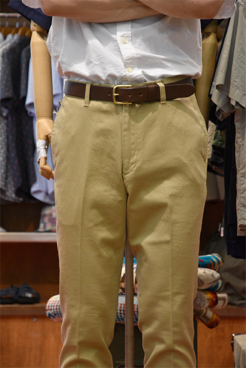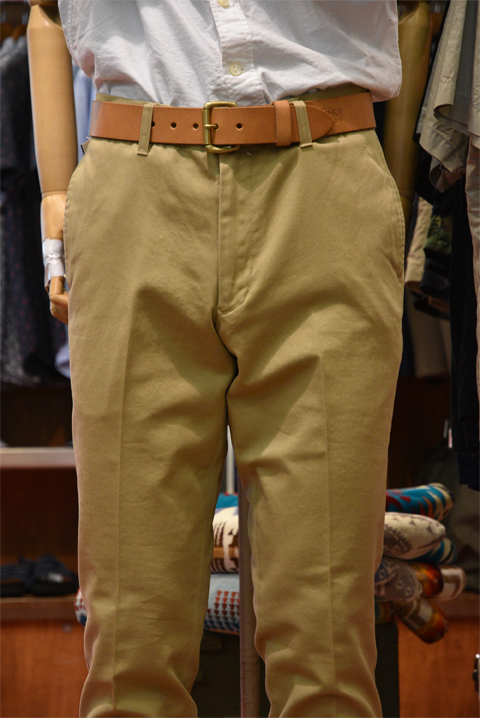 一番使い勝手の良いモデルで、ベルト幅3㎝ですので太すぎず細すぎずでバランスの取れた一本です。 普段、ベルト一本を使いまわしているという方にはこちらのモデルがおすすめです。 幅広いパンツと相性が良いですよ。バーンストーマーのチノパンと合わせてみました。