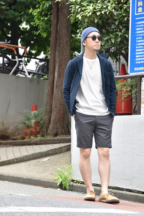 「ラフに羽織れるパイル素材のジャケットにスラックスショーツを合わせたコーディネート。色味をシンプルでサイズ感を気を付けることでキレイ目な印象になりますね♪」