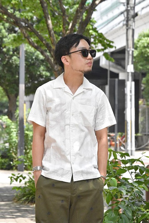 「HARRISS×Lani's General Storeの開襟アロハはパッと見無地の開襟ですが、よく見ると同色のパイナップル!清潔感があり、派手になりすぎないのでアロハ初心者の方にはオススメですよ。」
