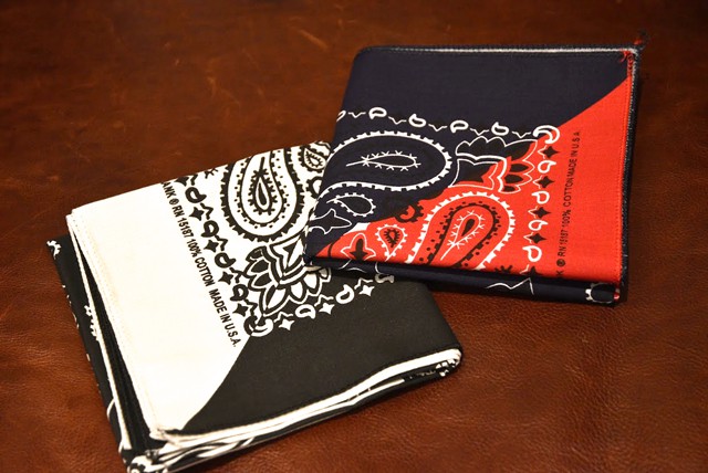 「ペイズリー柄ですが、こちらのバンダナはバイカラーになっており、気分によって使い分けたりも出来る、一度で二度美味しい感じになっておりますよ。」