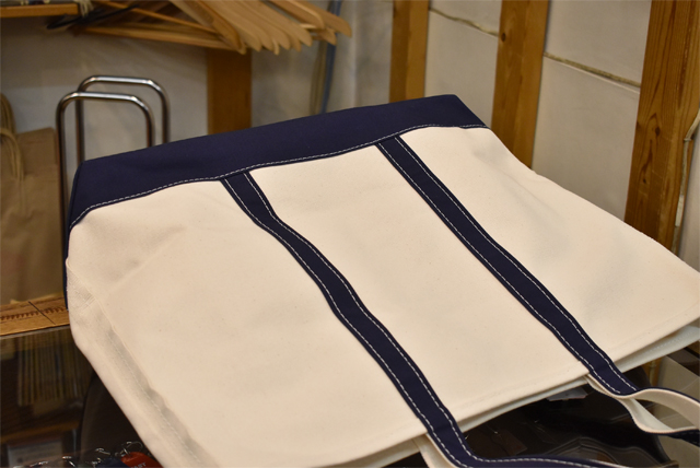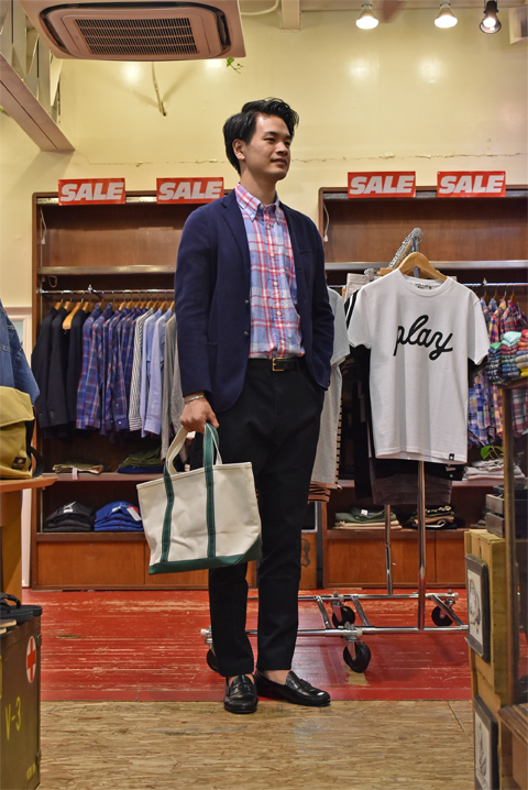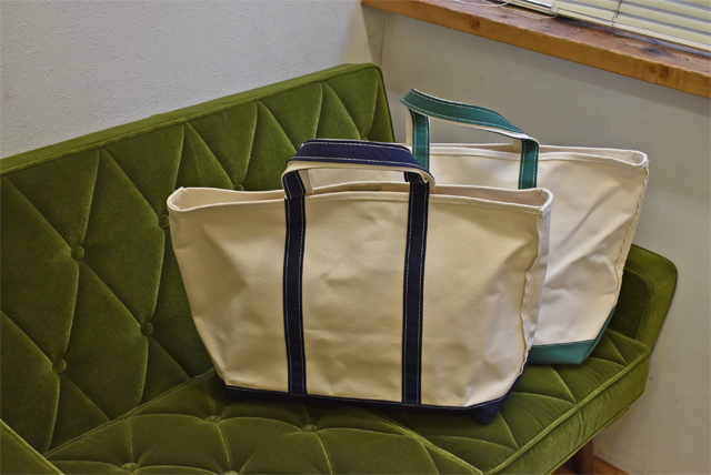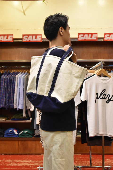 皆さんこんにちは、本並です。 さて、本日ご紹介致しますのは、トートバッグの定番商品、『L.L.Bean(エル・エル・ビーン)オリジナル Boat&Tote(ボートアンドトート)』でございます。 こちらの『 Boat&Tote(ボートアンドトート)』は1944年に氷を運ぶために発売されました。 発売以来、ずっとアメリカはメイン州の工場で作り続けています。つまり僕たちの大好きな『Made in U.S.A』のアイテムです。 こちらの一番の特徴と言えば分厚く頑強なキャンバス地。 もともとはごっつい氷塊を運ぶための道具ですから、生地にもそれなりの強度が必要となります。そこで採用されたのが24オンスのガッシガシのキャンバス地でした。 その丈夫なキャンバス地は強度の高さから、氷を運ぶためだけではなく、キャンプ道具入れとしてキャンパーたちに愛され、また、大量の教科書を持ち歩くアメリカの大学生たちに愛され、現在に至るまで70年以上多くの人に愛されています。 そんなBoat&Tote(ボートアンドトート)ですが、ZABOUでは普段使いにピッタリのミディアムサイズと、旅行やレジャーにオススメのラージサイズの2サイズでご用意致しました。 お色は定番色のダークグリーンとブルーの2色展開です。 L.L.Bean(エル・エル・ビーン)オリジナル Boat&Tote(ボートアンドトート)ミディアム  ¥7,452-L.L.Bean(エル・エル・ビーン)オリジナル Boat&Tote(ボートアンドトート)ラージ  ¥8,532- 日常使いするならミディアムで。 シティボーイ御用達の雑誌だってスッポリおさまります。 トラッドなスタイルに合わせたいですね! ●ジャケット Candidium(カンディディウム)  サイズ:L  ¥33,480-の30%OFF⇒¥23,436- ●シャツ BROOKS BROTHERS(ブルックス・ブラザーズ)   サイズ:M  ¥10,584-の50%OFF⇒¥5,292- ●パンツ BARNSTORMER(バーンストーマー)  サイズ:L  ¥15,984- ●ベルト JABEZ CLIFF(ジャベツ・クリフ)  ¥13,824- ●シューズ G.H.BASS(ジーエイチ・バス)  サイズ:US11  ¥17,280- ●バッグ L.L.Bean(エル・エル・ビーン)  ¥7,452- 身長約185cm 体重約72kg 足約29cm ラージサイズは2泊くらいの旅行ならいけてしまいそうなサイズ感。 夏のレジャーにどうでしょう。ペンドルトンのタオルを突っ込んで、海、川、キャンプ場なんかに是非出掛けて下さい。 ●シャツ HARRISS(ハリス)   サイズ:L  ¥14,580- ●パンツ MOCEAN(モーシャン)  サイズ:XL  ¥14,904- ●シューズ 私物 ●バッグ L.L.Bean(エル・エル・ビーン)  ¥8,532- ●タオル PENDLETON(ペンドルトン)  ¥9,504- ●サングラス IZIPIZI(イジピジ)  ¥5,940- 身長約185cm 体重約72kg 足約29cm 今回実際にラージサイズを購入させて頂きました。 ヘビーな生地感は好きなんですが、いかんせん硬くてちょっと取り回しづらかったので思い切ってセルフウォッシュを実行しました。 セルフウォッシュと言っても、バスタブに湯を張ってもみ洗いしてから洗濯機に入れて普通にまわすだけなんですけどね。 色移り等の可能性もあるみたいなので万が一実行する場合は仕上がりは自己責任でお願いします! 程々に柔らかく、クタッとなって皺も入り好みの雰囲気になりました。 新品と比べてみるとよく分かりますね。 【私物】 【新品】 色褪せだったり、経年変化もこのバッグの醍醐味です。 ガシガシ使い込みたいですね。是非お試しくださいませ! 大阪店インスタアカウント@ZABOUOSAKA13 東京店インスタアカウント@ZABOUTOKYO ☆通販で購入、商品詳細など詳しく見る! ⇒ZABOU WEB SHOP(ウェブショップ) 通販サイト ☆実店舗へのご案内、お店までへの行き方を地図や動画でご紹介! ⇒ZABOUのお店