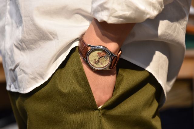 古い世界地図を文字盤に配した、このブランドらしい、ユニークなデザイン。