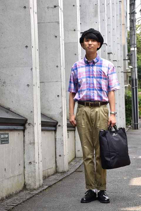 「半袖シャツをチノパンにタックインしたアメトラスタイル♪タックインして着ることによって一気に上品さが増しますね。」