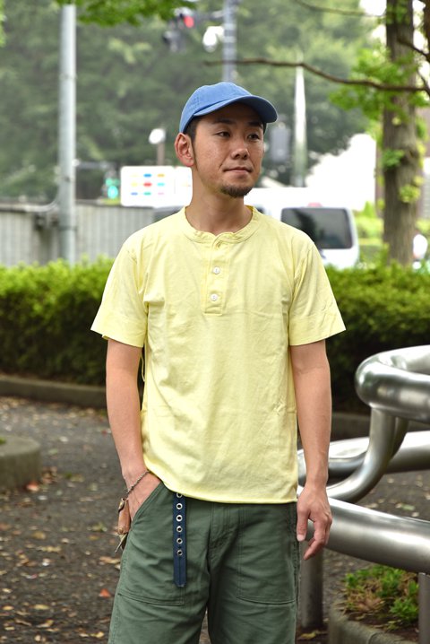 「ジャストサイズでも良い、夏なので思い切ってサイズアップしてラフに着るのもオススメなHealthknit(ヘルスニット)のヘンリーネック Tシャツ。」