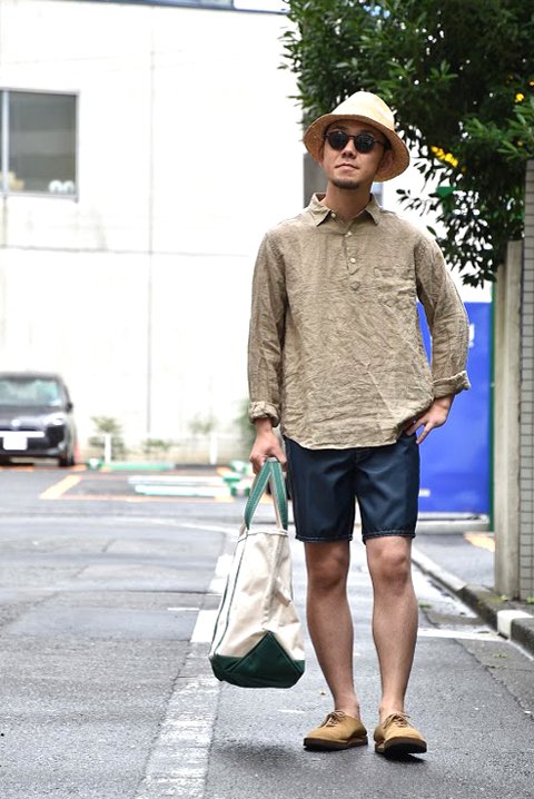 「ゆったりシルエットのリネンシャツにサーフショーツを合わせたコーディネイト。子どもっぽくなりがちなショーツはトップスをサイズアップすることで大人な雰囲気になりますね♪」