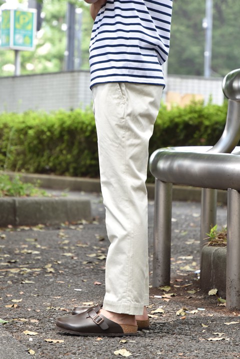 「膝から下にかけて緩やかにテーパードがかかっていて、スッキリとしたシルエットになっているD.C.WHITE(ディーシーホワイト)のチノトラウザーズはこの時期におすすめですよ。」