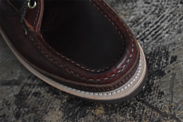 この形、この仕様こそがラッセルモカシン と言っても良いほどの面構え。 ブーツという言葉に抵抗ある方にこそオススメしたいこちらのモデル。 まず高すぎず、低すぎない絶妙なハイト。 日本人の足なら踝も隠れ切らないこの長さが使いやすい。 秋や冬だけでなく、夏場はショーツと合わせることにより、使用できる期間はほぼ一年中。 4eyelet