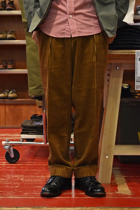 「太めのコーデュロイパンツ欲しかったんですよね~!こういうパンツにはドレスシューズで下は綺麗に、ワークの匂いのする男臭いアウターでバランスを取って上げるとええ感じです!冬はこれのインナーにシェトランドセーターで、生地で季節感を楽しみたい!」
