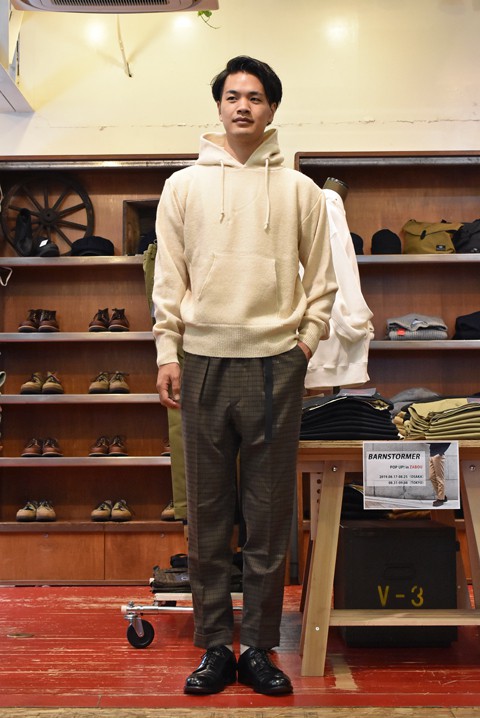 クラシカルなガンクラブチェックも季節感があっていい。トップスはシェトランドウールを使用したニットのフーディ。リバースウィーブスウェットの様な気軽さとニットの上品さを上手くミックスしたバーンストーマーらしい大人カジュアルな一着です。」