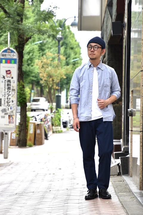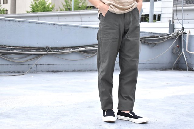 「GUNG HO(ガンホー)スリムフィットファティーグ 。コシのあるダック地は経年変化が楽しみなアイテムです。秋冬は革靴と合わせて頂き、今時期はmoonstarのスリッポンと合わせて軽めな足元でいかがでしょうか。」