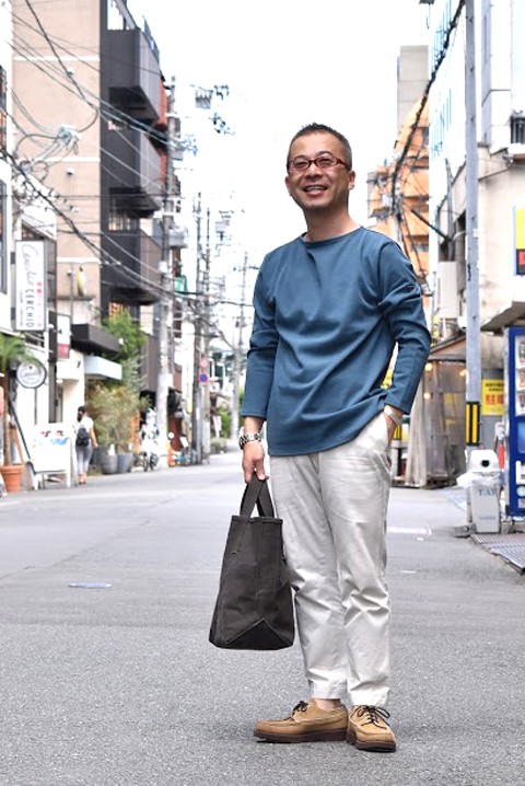 「ターコイズグリーンのカットソーにサンド(ホワイト)の色味で合わせた、トラッドスタイル。足元はスウェードのシューズと合わせて温かみのある印象になりますね。」