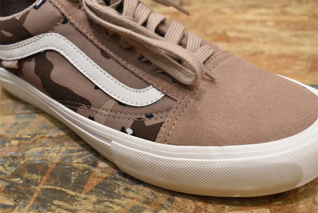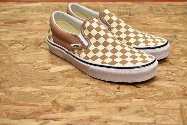 チェッカーフラッグのスリッポンも、珍しいキャメル×クリーム。